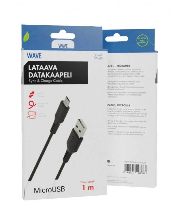 Wave Lataava datakaapeli USB-A -> MicroUSB -liitännöillä. Kaapelin pituus 1 metri ja väri musta. Latausteho 10,5W max. Tiedonsiirtonopeus 480 Mbps max. Yhteensopiva Micro USB -liitännällä varustettujen matkapuhelimien kanssa.