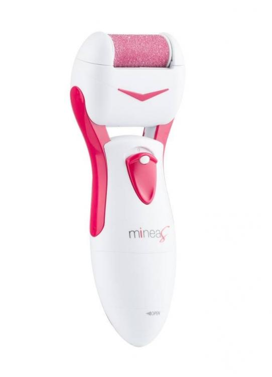 MINEAS jalkaraspi. Sisältää yhden hiomarullan ja puhdistusharjan. Toimii kahdella AA -paristolla (ei sisälly pakettiin).