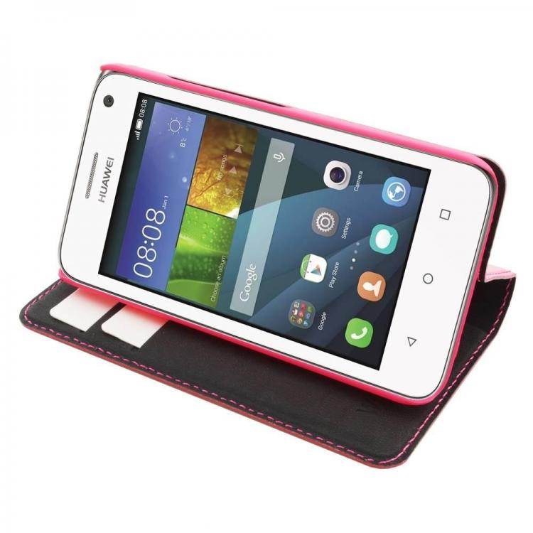 WAVE "Book case" kotelo. Pinkki täsmäistuva kotelo Huawei Y360. Kirjamalli. Paikat myös maksukorteille. Materiaali laadukasta PU nahkaa.