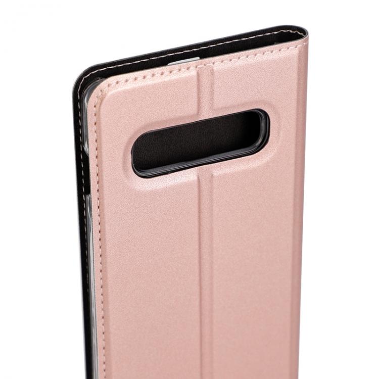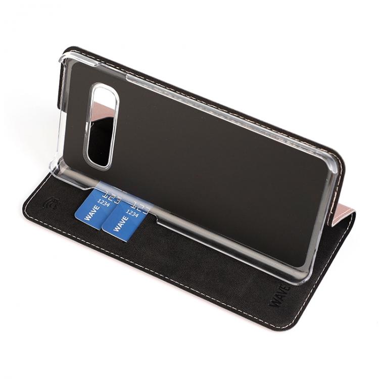 WAVE Book Case ruusukultainen suojakotelo Samsung Galaxy S10+ (Plus) puhelimelle. Magneettisulkuinen kansi, korttipaikat RFID suojauksella ja läpinäkyvä muovikelkka (PC). Pintamateriaali laadukasta nahkaa.