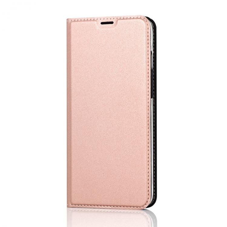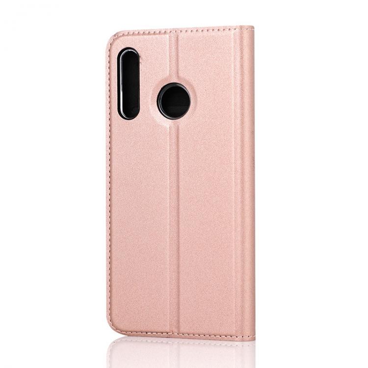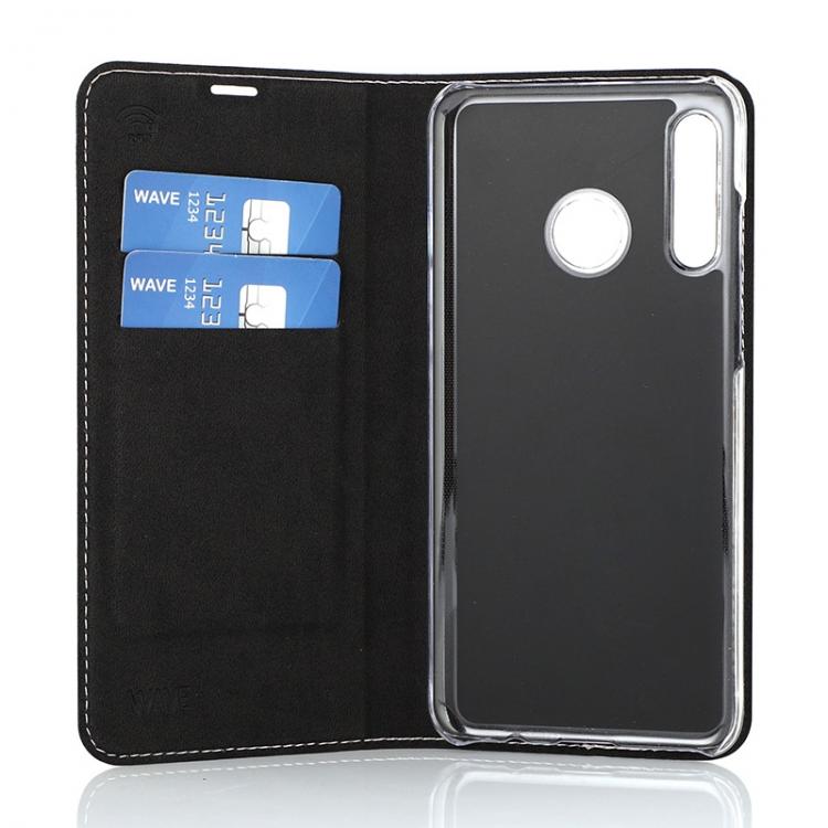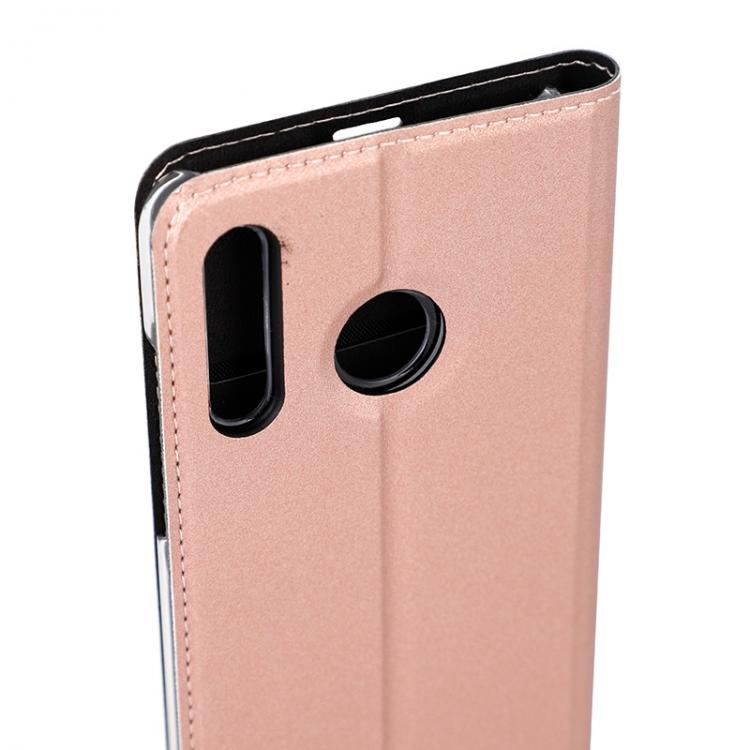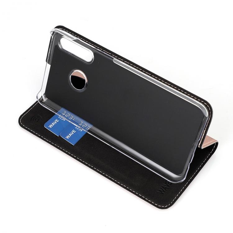 WAVE Book Case ruusukultainen suojakotelo Huawei P30 Lite puhelimelle. Magneettisulkuinen kansi, korttipaikat RFID suojauksella ja läpinäkyvä muovikelkka (PC). Pintamateriaali laadukasta nahkaa.