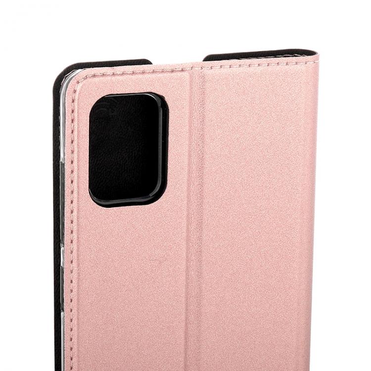 Wave Book Case ruusukultainen suojakotelo Samsung Galaxy A51 puhelimelle. Magneettisulkuinen kansi, korttipaikat RFID suojauksella ja läpinäkyvä muovikelkka (PC). Pintamateriaali laadukasta nahkaa.