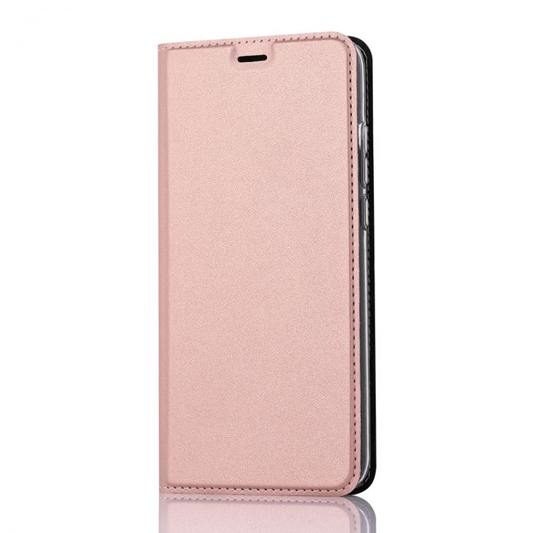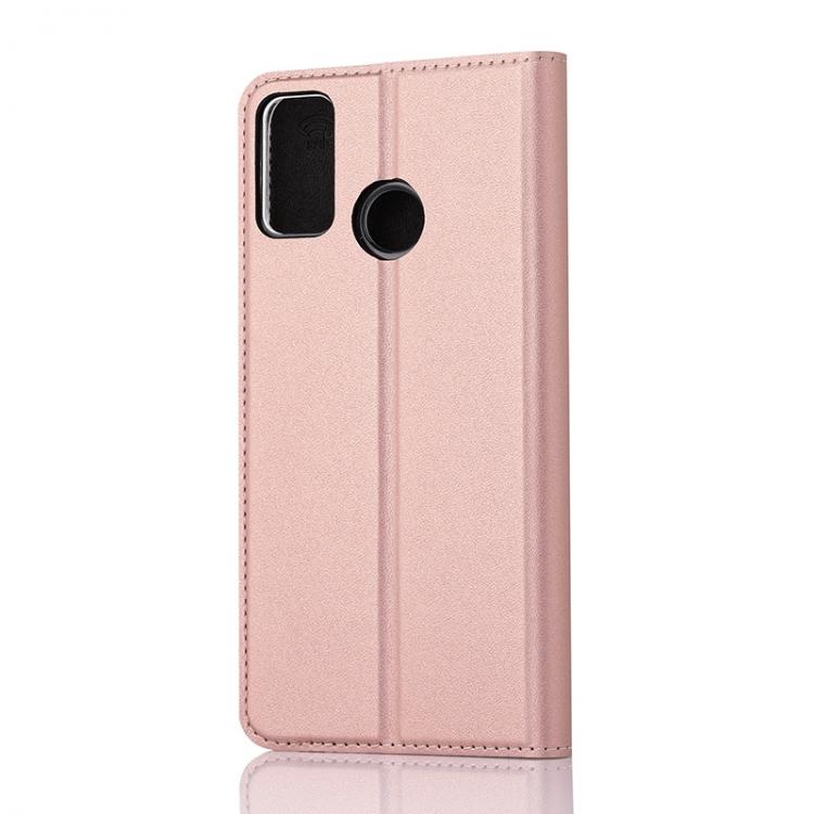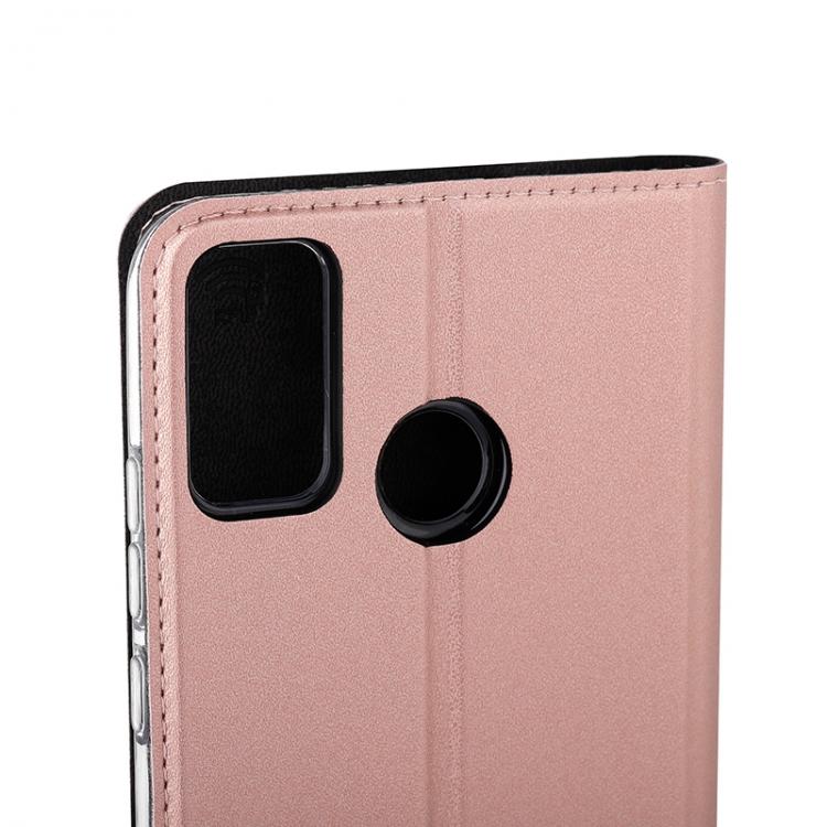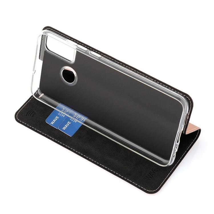 Wave Book Case ruusukultainen suojakotelo Honor 9X Lite puhelimelle. Magneettisulkuinen kansi, korttipaikat RFID suojauksella ja läpinäkyvä muovikelkka (TPU). Pintamateriaali laadukasta nahkaa.