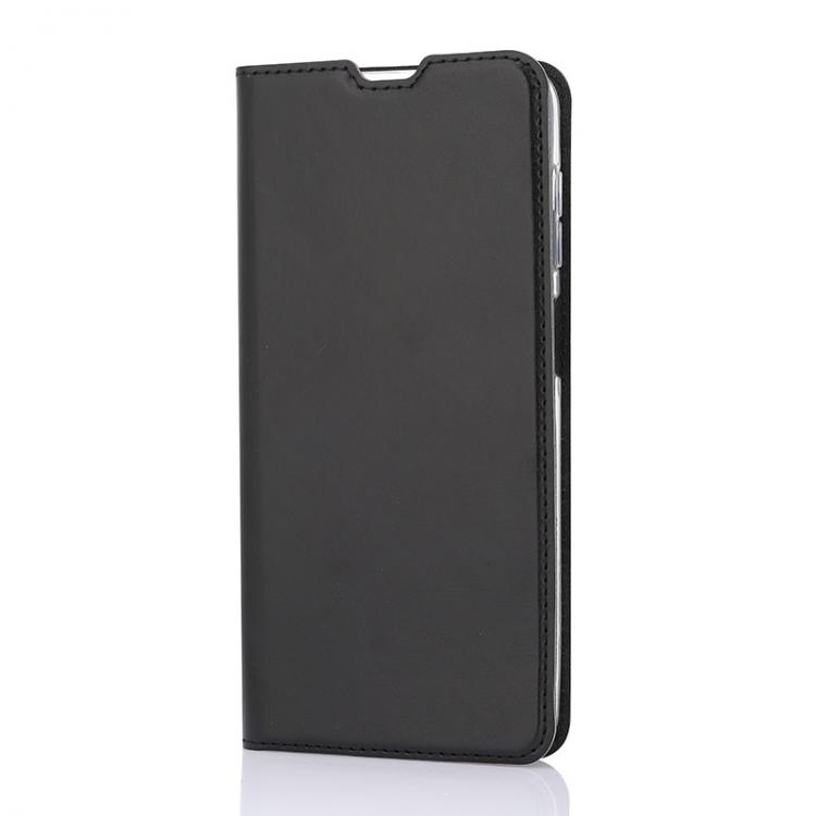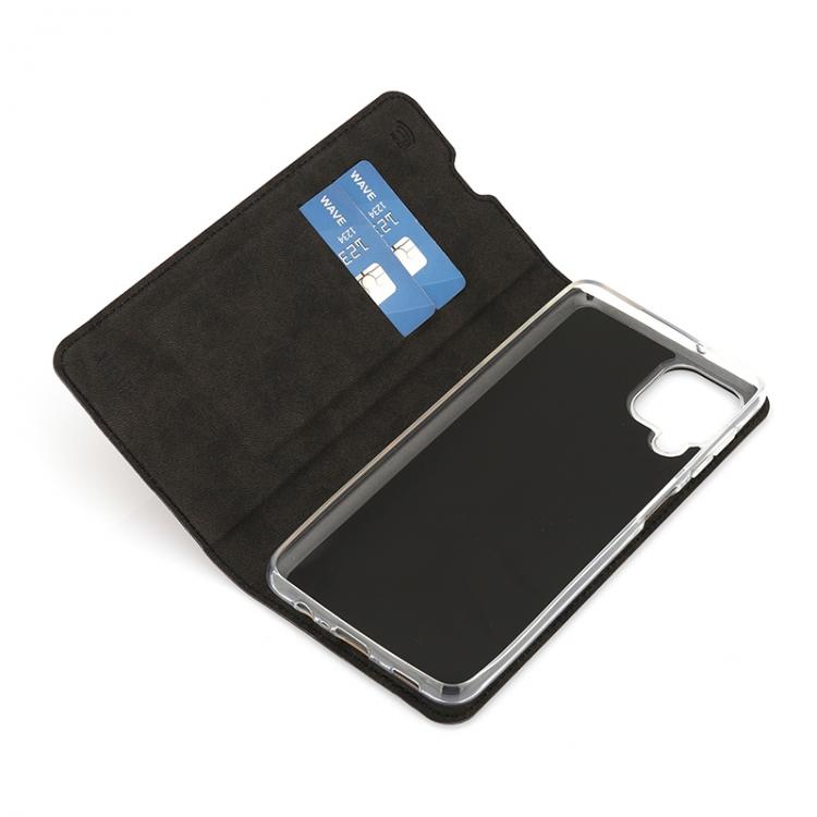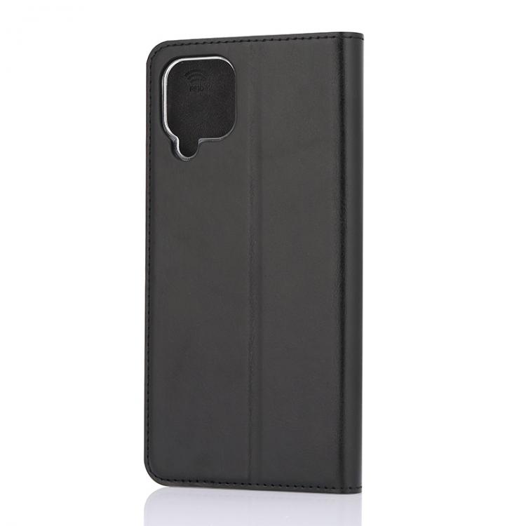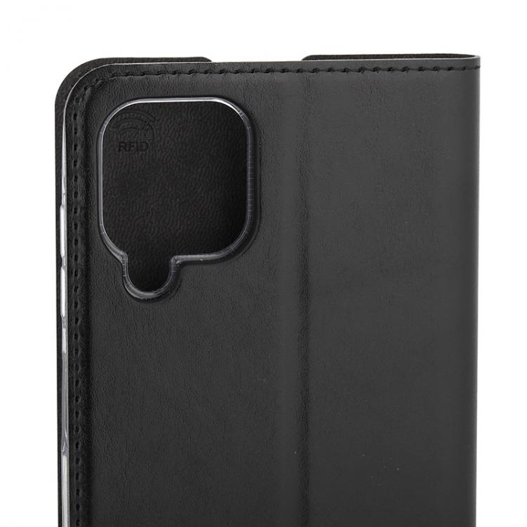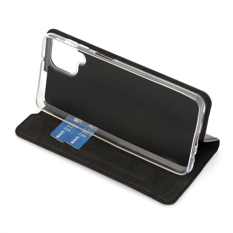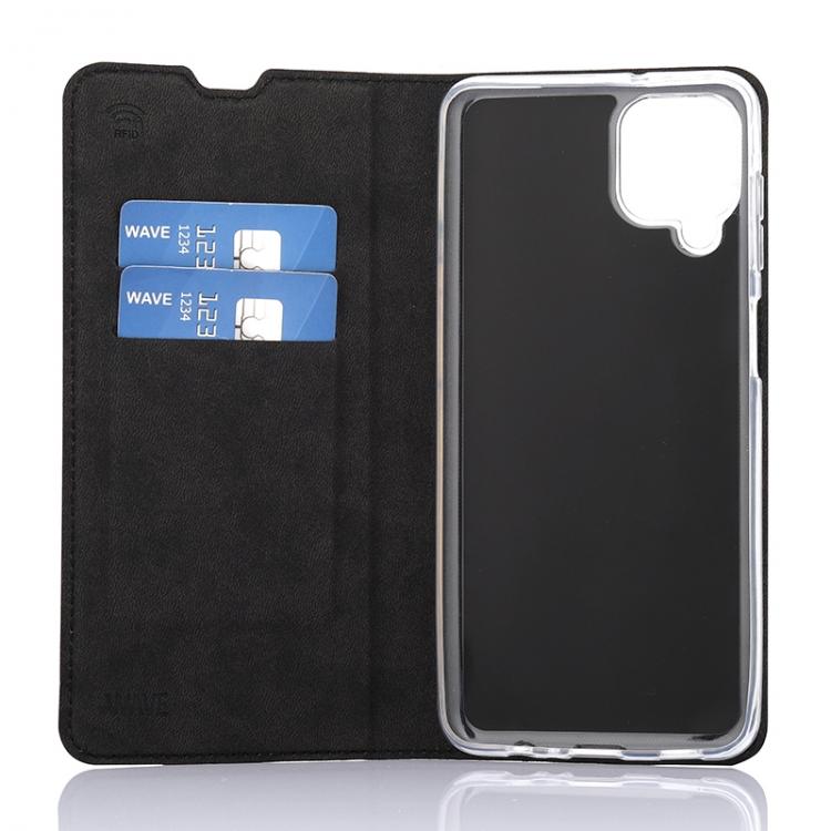 Wave Book Case musta suojakotelo Samsung Galaxy A12 puhelimelle. Magneettisulkuinen kansi, korttipaikat RFID suojauksella ja läpinäkyvä muovikelkka (TPU). Pintamateriaali laadukasta nahkaa.