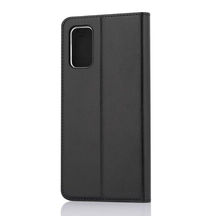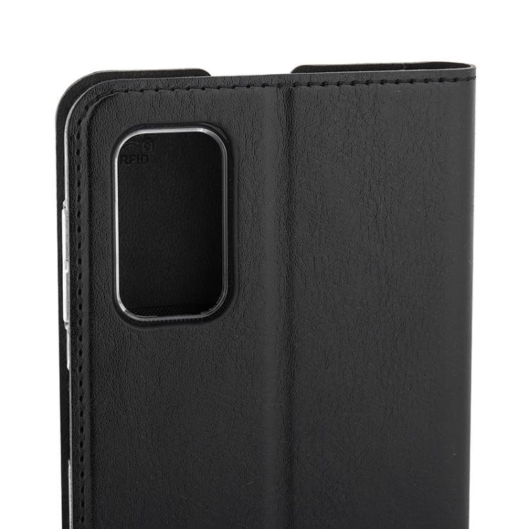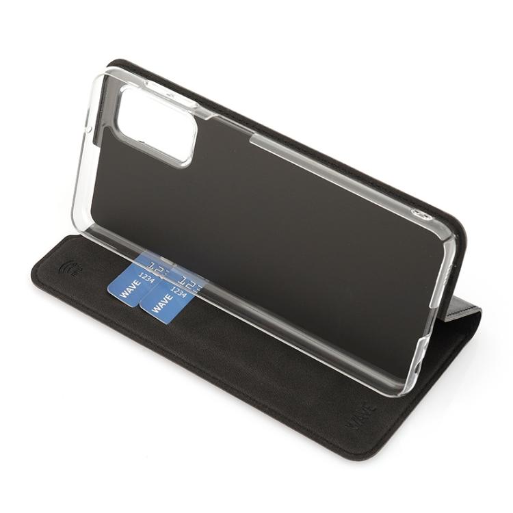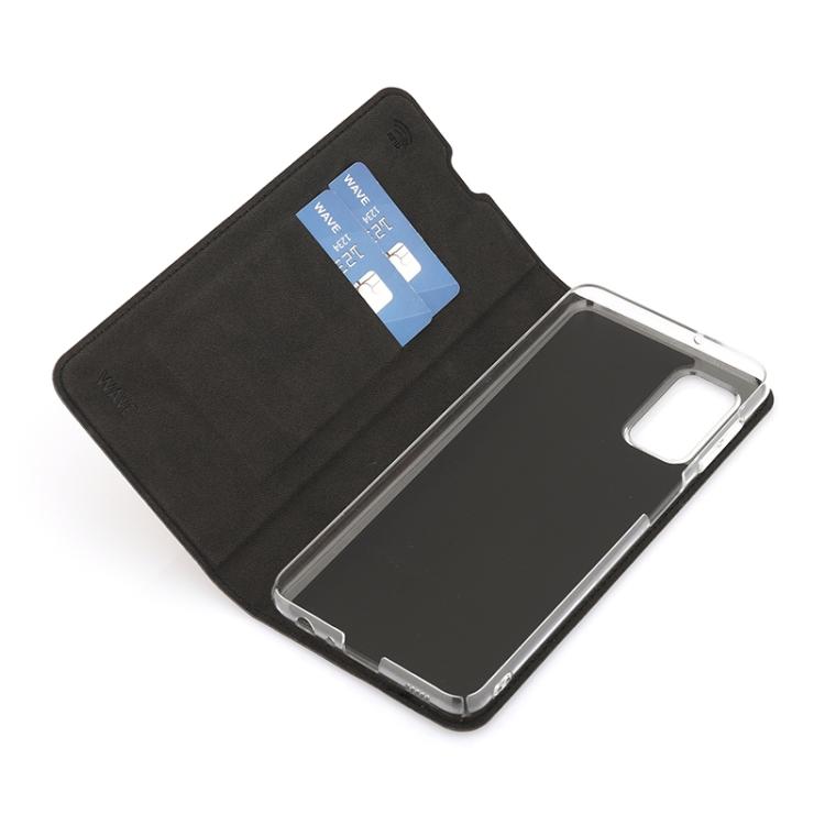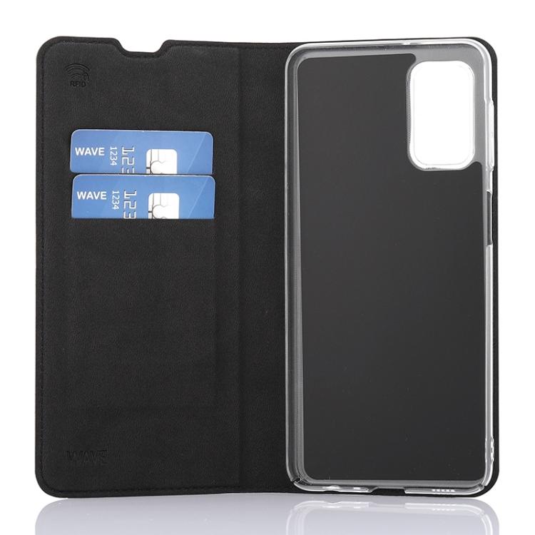 Wave Book Case musta suojakotelo Samsung Galaxy A32 5G puhelimelle. Magneettisulkuinen kansi, korttipaikat RFID suojauksella ja läpinäkyvä muovikelkka (PC). Pintamateriaali laadukasta nahkaa.