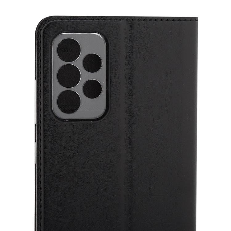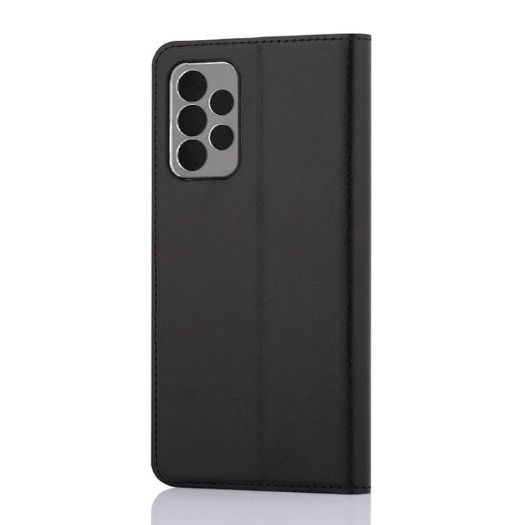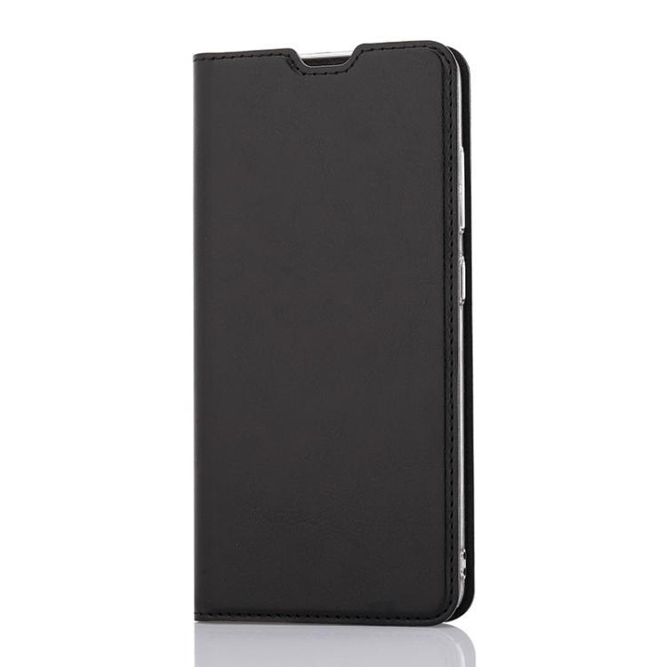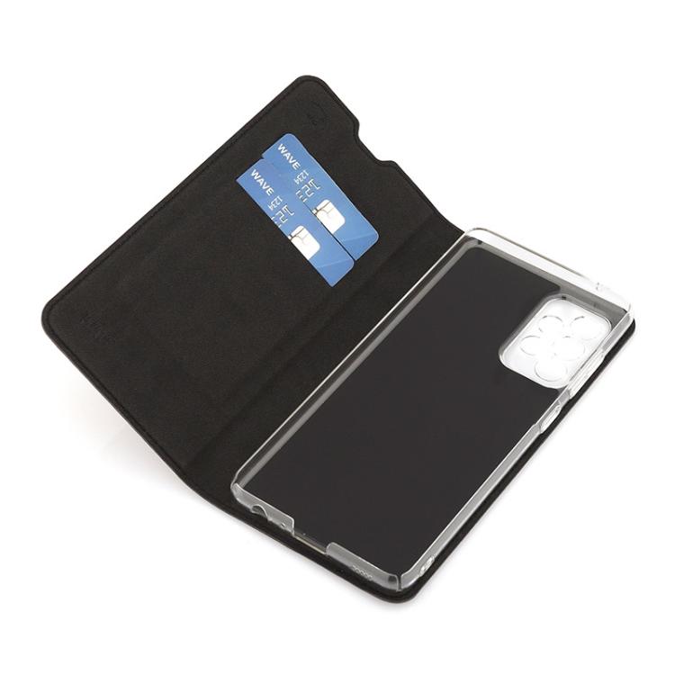 Wave Book Case musta suojakotelo Samsung Galaxy A52 5G, Samsung Galaxy A52 puhelimille. Magneettisulkuinen kansi, korttipaikat RFID suojauksella ja läpinäkyvä muovikelkka (PC). Pintamateriaali laadukasta nahkaa.