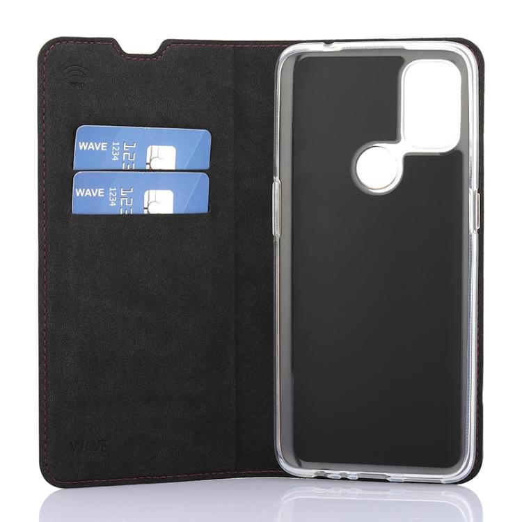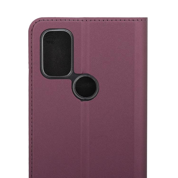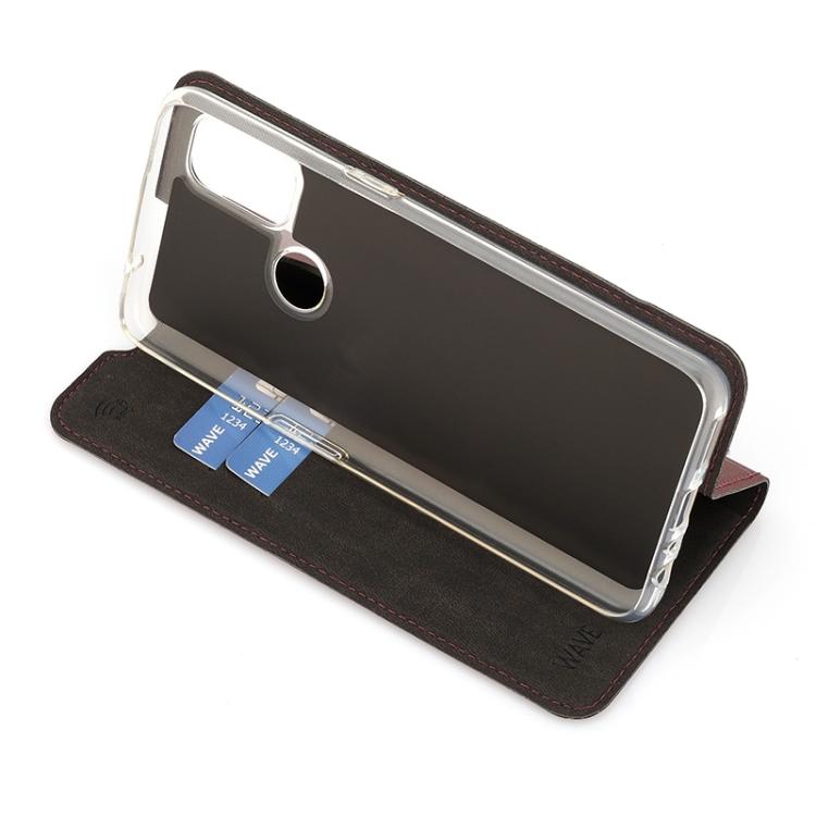 Wave Book Case smoky sangria suojakotelo OnePlus Nord N10 5G puhelimelle. Magneettisulkuinen kansi, korttipaikat RFID suojauksella ja läpinäkyvä muovikelkka (TPU). Pintamateriaali laadukasta nahkaa.