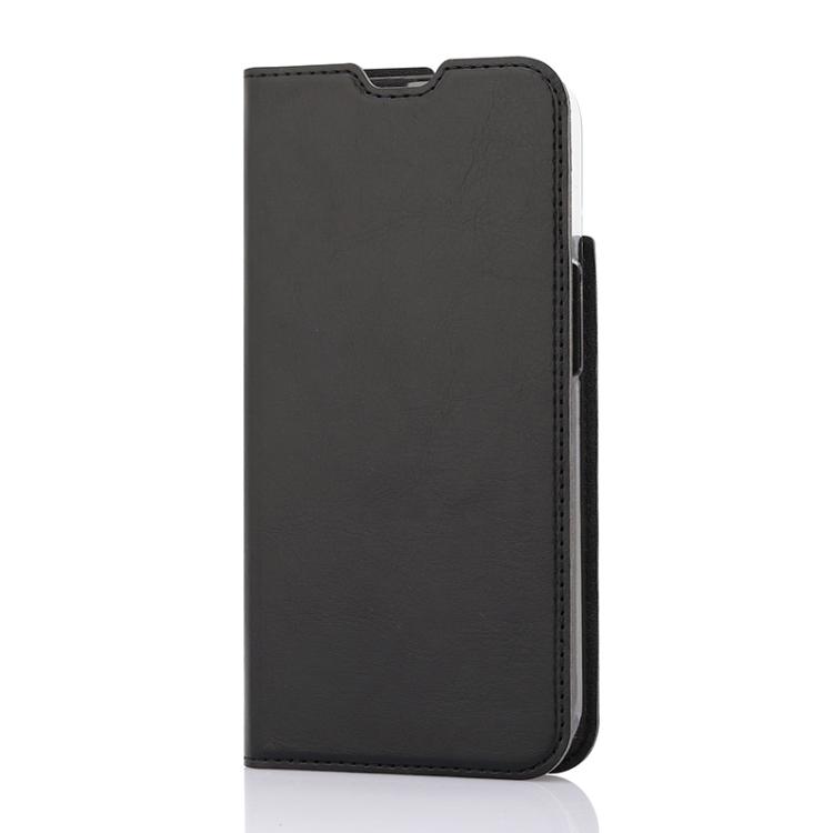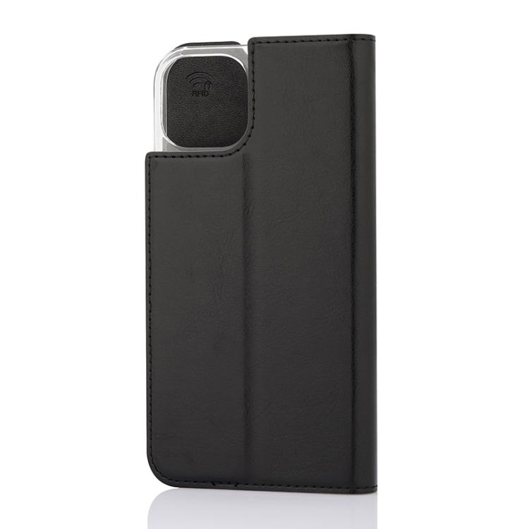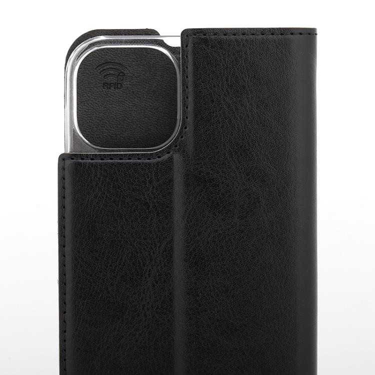 Wave Book Case musta suojakotelo Apple iPhone 13 puhelimelle. Magneettisulkuinen kansi, korttipaikat RFID suojauksella ja läpinäkyvä muovikelkka (PC). Pintamateriaali laadukasta nahkaa.