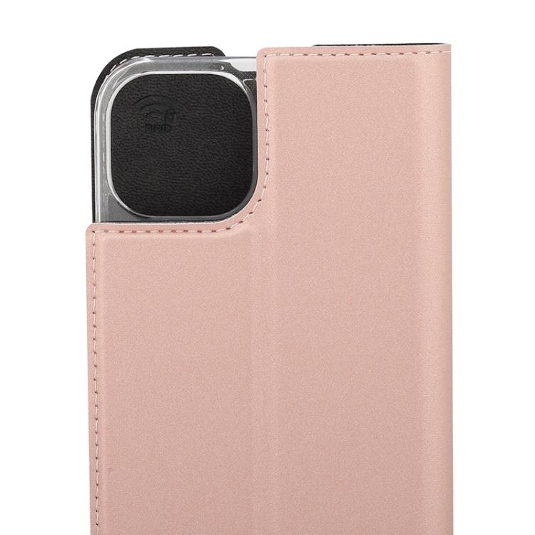 Wave Book Case ruusukultainen suojakotelo Apple iPhone 13 puhelimelle. Magneettisulkuinen kansi, korttipaikat RFID suojauksella ja läpinäkyvä muovikelkka (PC). Pintamateriaali laadukasta nahkaa.