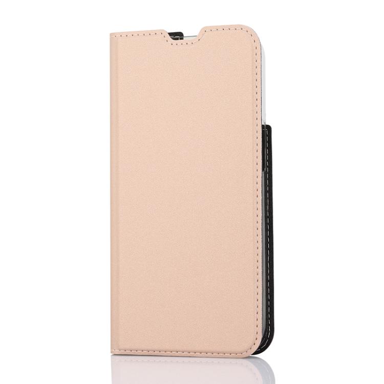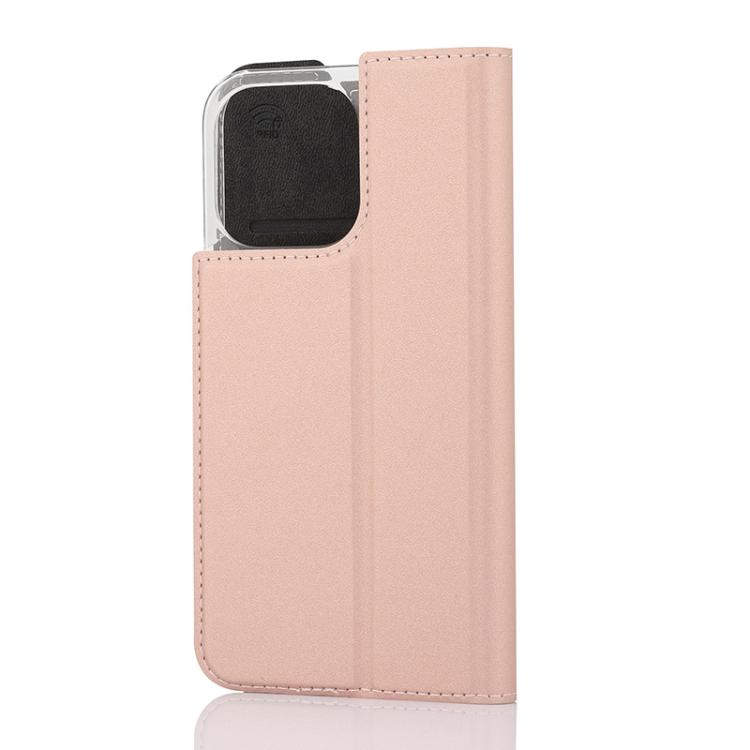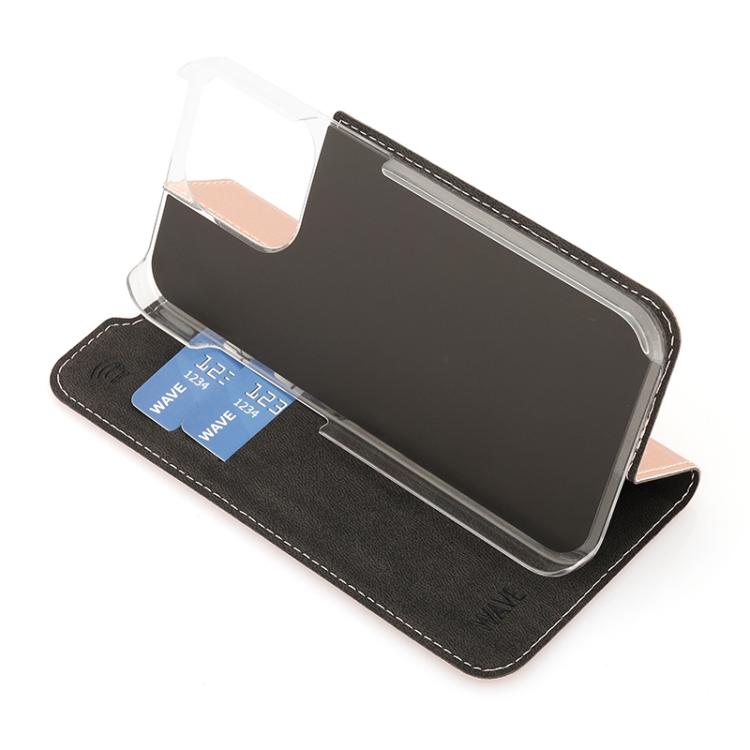 Wave Book Case ruusukultainen suojakotelo Apple iPhone 13 Pro puhelimelle. Magneettisulkuinen kansi, korttipaikat RFID suojauksella ja läpinäkyvä muovikelkka (PC). Pintamateriaali laadukasta nahkaa.