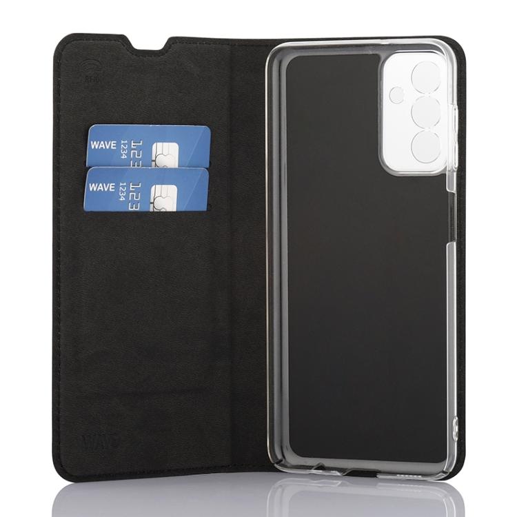 Wave Book Case musta suojakotelo Samsung Galaxy A13 5G puhelimelle. Magneettisulkuinen kansi, korttipaikat RFID suojauksella ja läpinäkyvä muovikelkka (PC). Pintamateriaali laadukasta nahkaa.