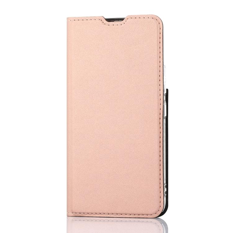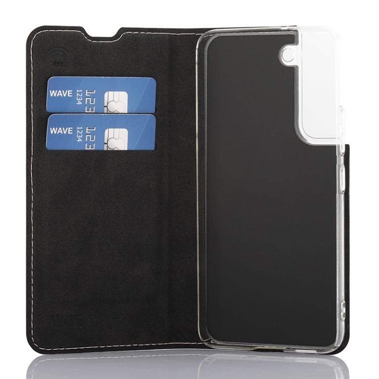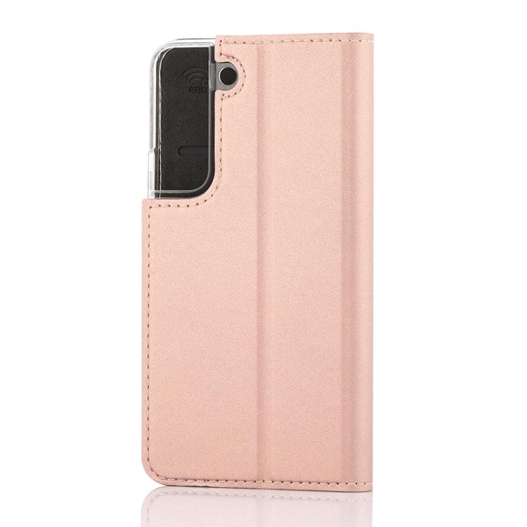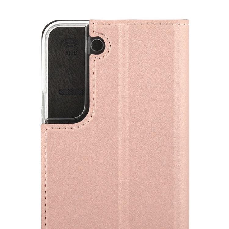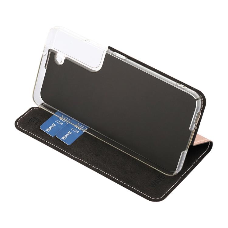 Wave Book Case ruusukultainen suojakotelo Samsung Galaxy S22 puhelimelle. Magneettisulkuinen kansi, korttipaikat RFID suojauksella ja läpinäkyvä muovikelkka (PC). Pintamateriaali laadukasta nahkaa.