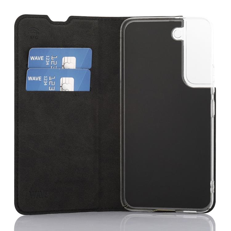 Wave Book Case musta suojakotelo Samsung Galaxy S22 puhelimelle. Magneettisulkuinen kansi, korttipaikat RFID suojauksella ja läpinäkyvä muovikelkka (PC). Pintamateriaali laadukasta nahkaa.