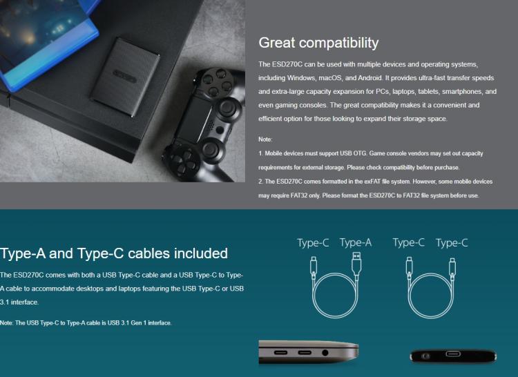 Kovalevy on varustettu USB Type-C (USB-C) liitännällä ja se hyödyntää tiedonsiirrossa USB 3.1 Gen 1 väylästandardia, mikä mahdollistaa parhaimmillaan 520MB/s tiedonsiirtonopeuden. Laite on myös taaksepäin yhteensopiva vanhempien väylästandardien kanssa.