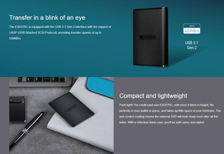Transcend ESD270C -sarjan ulkoinen SSD kiintolevy. Kovalevyn kapasiteetti on 1TB ja se toimii USB Type-C (USB 3.1 Gen 2) liitännällä. Siirtonopeus jopa 520MB/s. Muita ominaisuuksia pienikokoinen muotoilu ja 3D NAND flash -muisti. Väriltään hopea.
