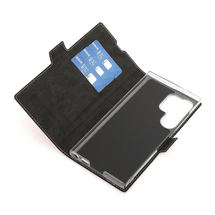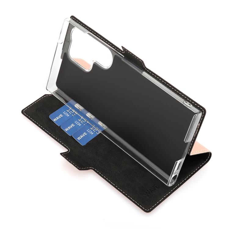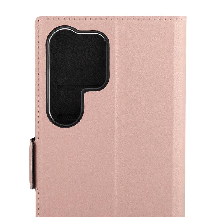 Wave Book Case ruusukultainen suojakotelo Samsung Galaxy S23 Ultra 5G puhelimelle. Magneettisulkuinen kansi, korttipaikat RFID suojauksella ja läpinäkyvä muovikelkka (PC). Pintamateriaali laadukasta nahkaa.