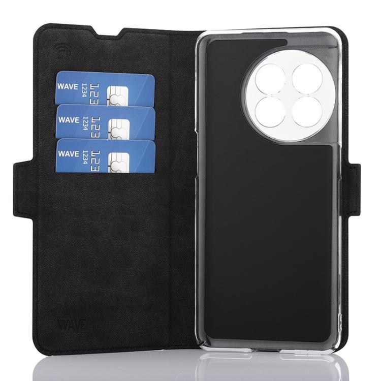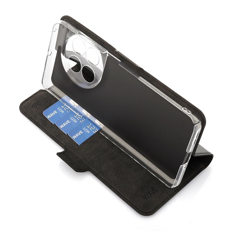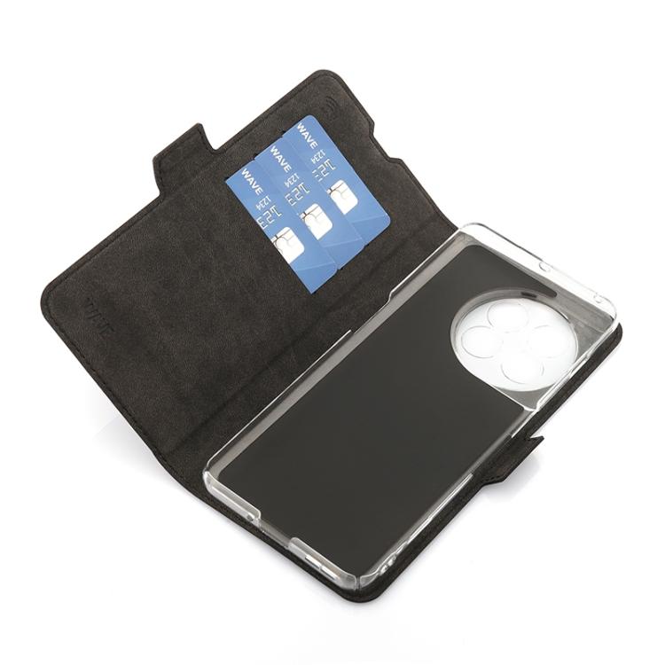 Wave Book Case musta suojakotelo OnePlus 11 puhelimelle. Magneettisulkuinen kansi, korttipaikat RFID suojauksella ja läpinäkyvä muovikelkka (PC). Pintamateriaali laadukasta nahkaa.