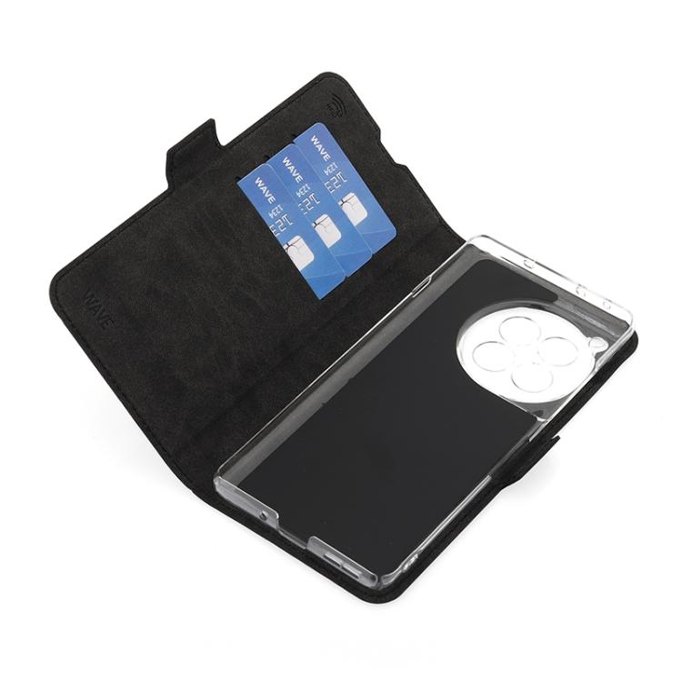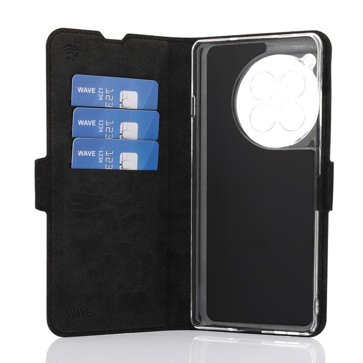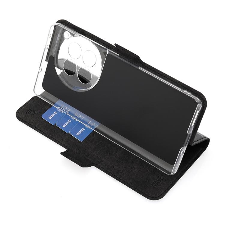 Wave Book Case musta suojakotelo OnePlus 12R puhelimelle. Magneettisulkuinen kansi, korttipaikat RFID suojauksella ja läpinäkyvä muovikelkka (PC). Pintamateriaali laadukasta nahkaa, jossa antimikrobipinnoite.