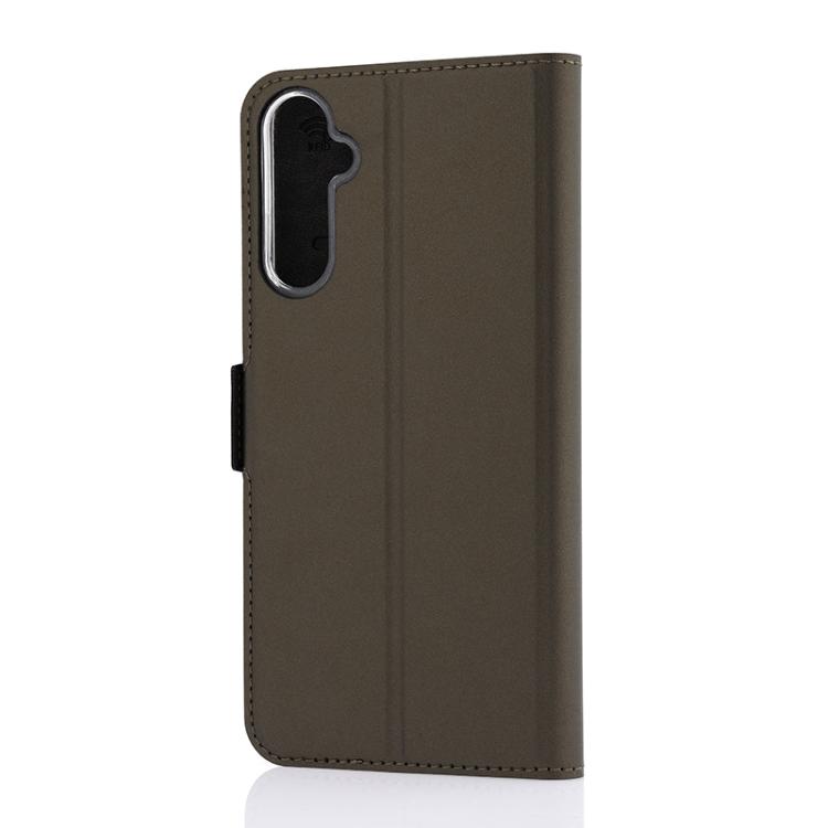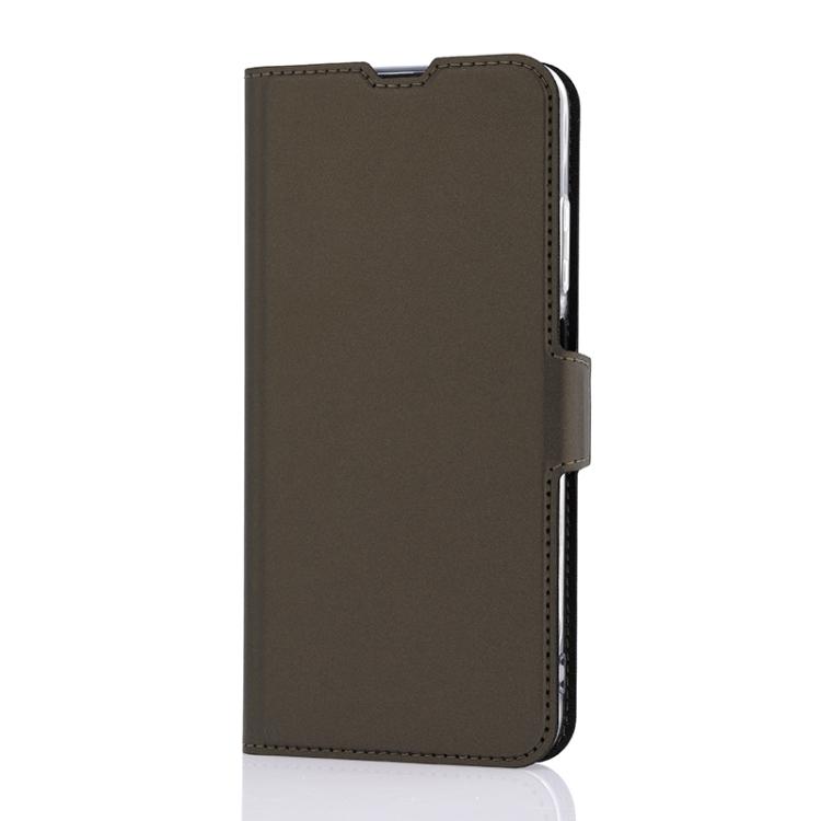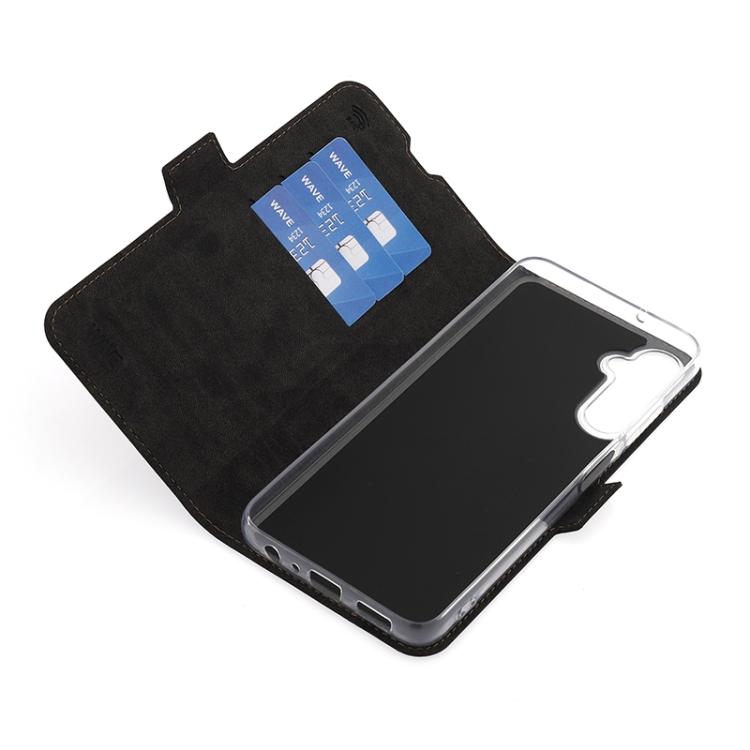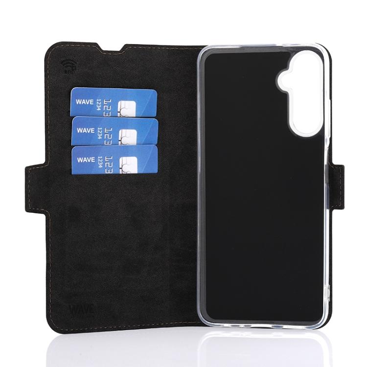 Wave Book Case taupe suojakotelo Samsung Galaxy A05s puhelimelle. Magneettisulkuinen kansi, korttipaikat RFID suojauksella ja läpinäkyvä muovikelkka (TPU). Pintamateriaali laadukasta nahkaa, jossa antimikrobipinnoite.