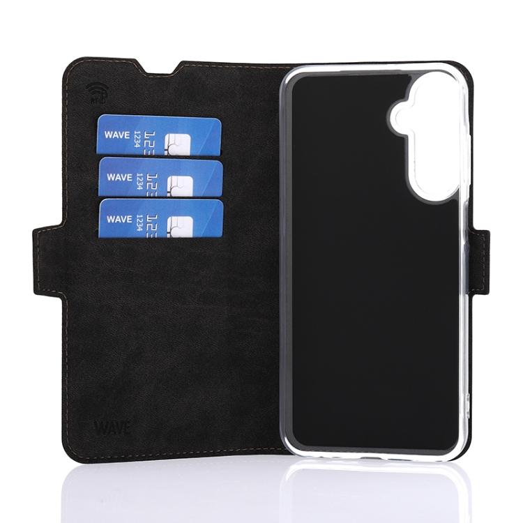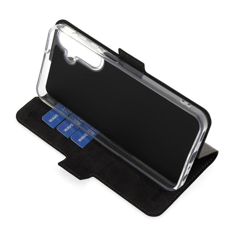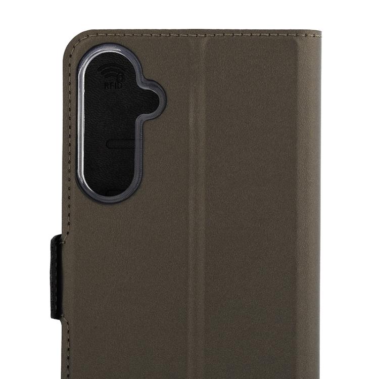 Wave Book Case taupe suojakotelo Samsung Galaxy A25 5G puhelimelle. Magneettisulkuinen kansi, korttipaikat RFID suojauksella ja läpinäkyvä muovikelkka (TPU). Pintamateriaali laadukasta nahkaa, jossa antimikrobipinnoite.