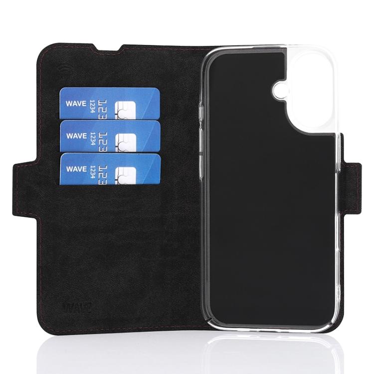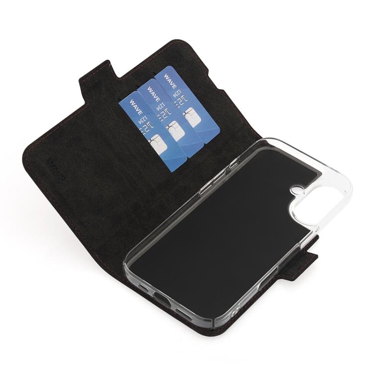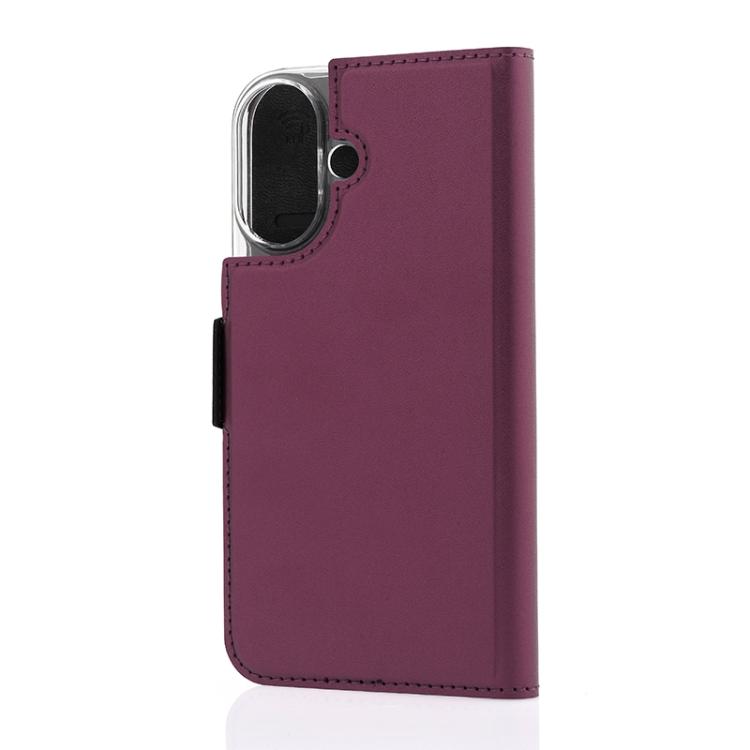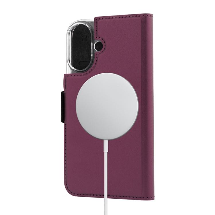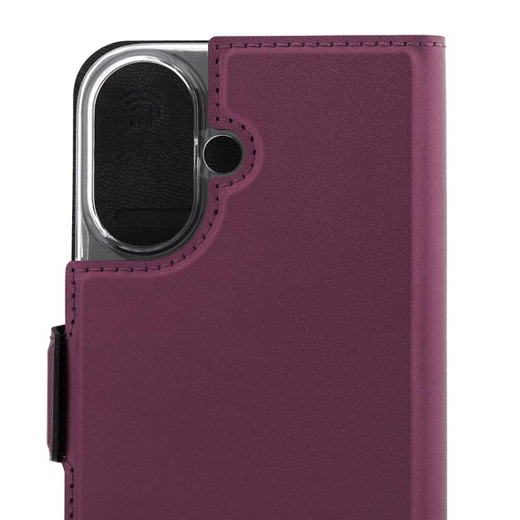 Wave Book Case smoky sangria suojakotelo Apple iPhone 16 puhelimelle. MagSafe-yhteensopiva. Magneettisulkuinen kansi, korttipaikat RFID suojauksella ja läpinäkyvä muovikelkka (PC). Pintamateriaali laadukasta nahkaa, jossa antimikrobipinnoite.