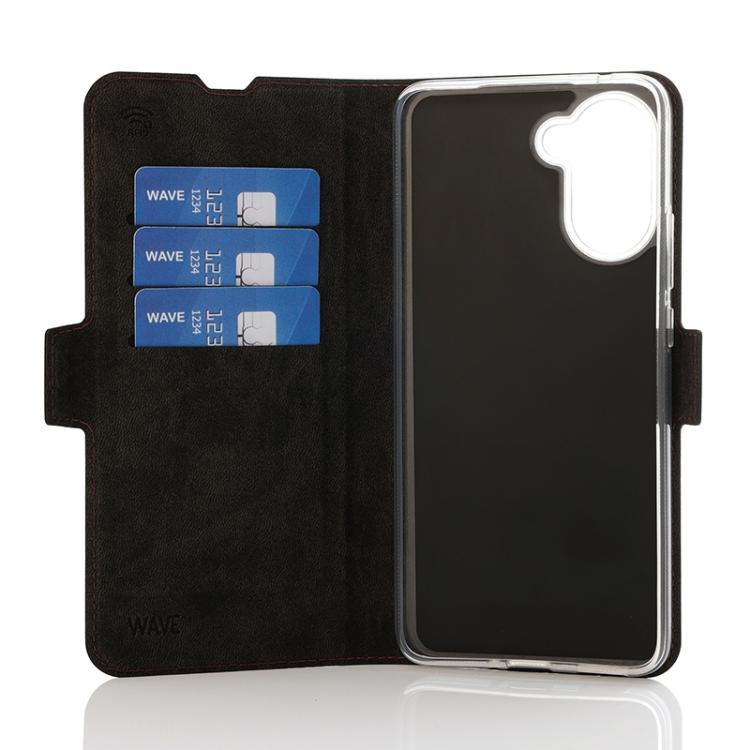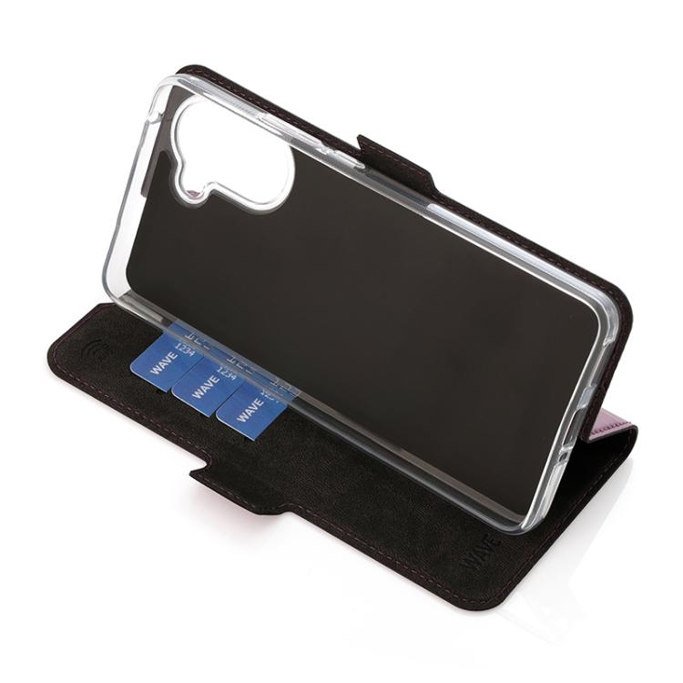 Wave Book Case smoky sangria suojakotelo OnePlus Nord CE5 5G puhelimelle. Magneettisulkuinen kansi, korttipaikat RFID suojauksella ja läpinäkyvä muovikelkka (TPU). Pintamateriaali laadukasta nahkaa, jossa antimikrobipinnoite.