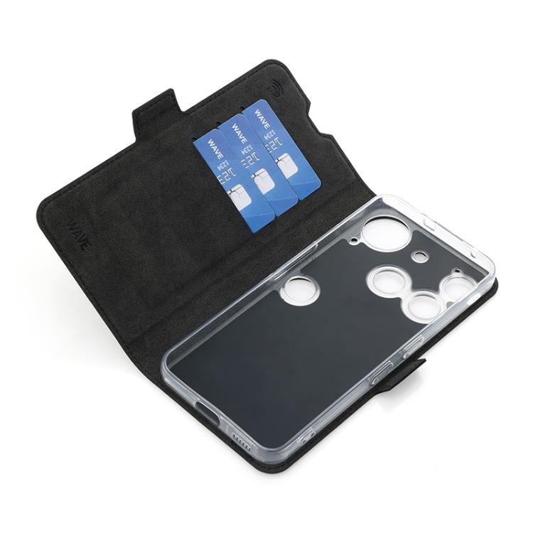 Wave Book Case musta suojakotelo Nothing Phone (3) puhelimelle. Magneettisulkuinen kansi, korttipaikat RFID suojauksella ja läpinäkyvä muovikelkka (TPU). Pintamateriaali laadukasta nahkaa, jossa antimikrobipinnoite.