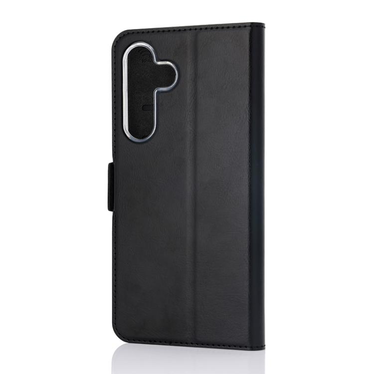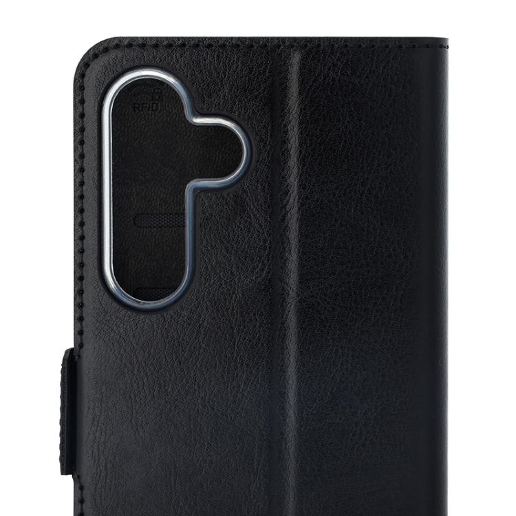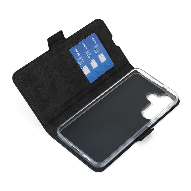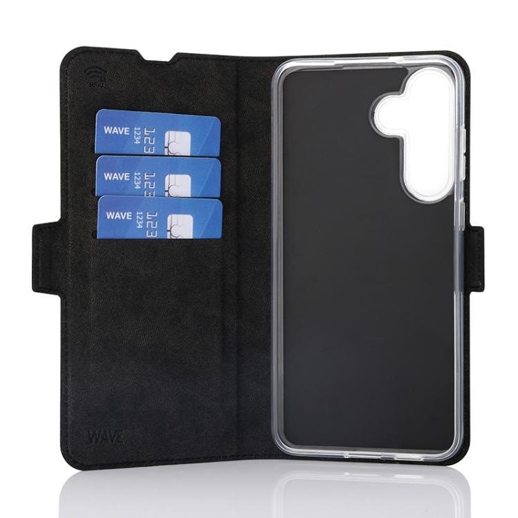 Wave Book Case musta suojakotelo Samsung Galaxy S25 FE 5G puhelimelle. Magneettisulkuinen kansi, korttipaikat RFID suojauksella ja läpinäkyvä muovikelkka (TPU). Pintamateriaali laadukasta nahkaa, jossa antimikrobipinnoite.