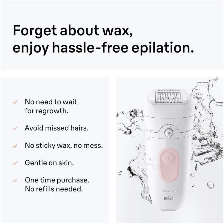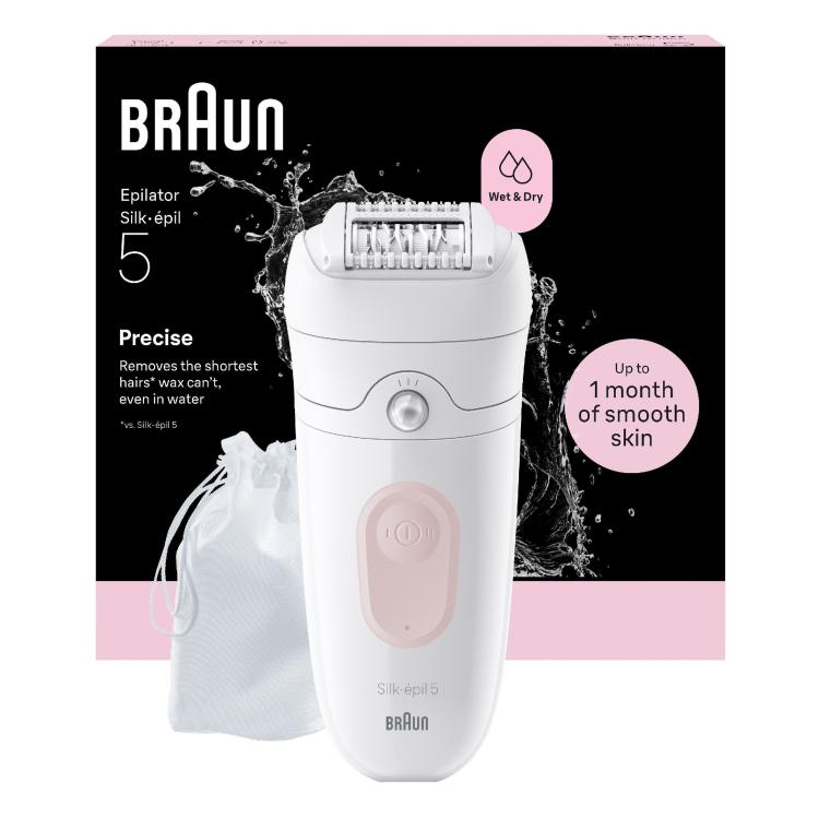 Braun Silk·épil 5 -epilaattori takaa sileän ihon jopa kuukaudeksi, milloin tahansa. Tämän johdottoman Braun-epilaattorin MicroGrip-pinsettiteknologia poistaa nekin ihokarvat, joihin vaha ei tehoa (pituus 0,5 mm). Hierontarulla vähentää kivun tunnetta. Ei enää vaivalloista ihokarvojen uudelleenkasvun odottelua kuten muissa ihokarvanpoistotuotteissa (esim. vaha). Erittäin kätevä epilaattori, joka ei vaadi puhdistusta tai kauneushoitolakäyntejä. Vinkki: käsittely on vähemmän kivulias, kun epiloit kylvyssä tai suihkussa lämpimän veden alla.