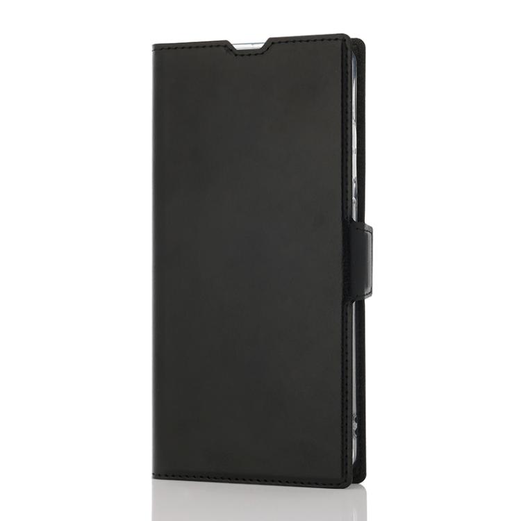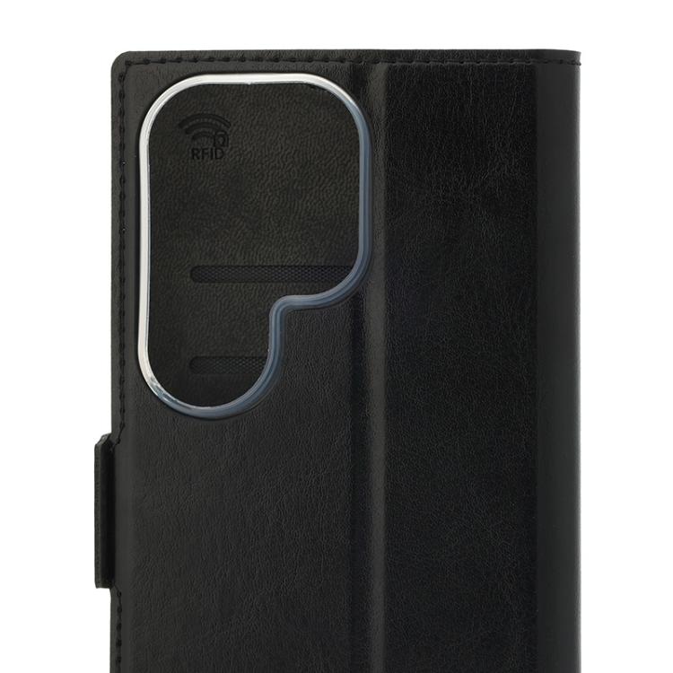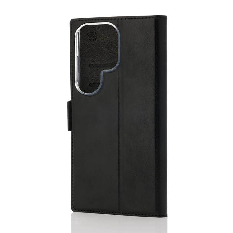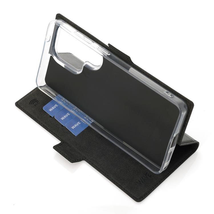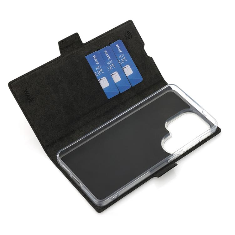 Wave Book Case musta suojakotelo Samsung Galaxy S26 Ultra 5G puhelimelle. Magneettisulkuinen kansi, korttipaikat RFID suojauksella ja läpinäkyvä muovikelkka (TPU). Pintamateriaali laadukasta nahkaa, jossa antimikrobipinnoite.
