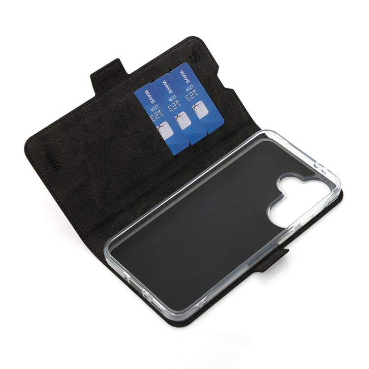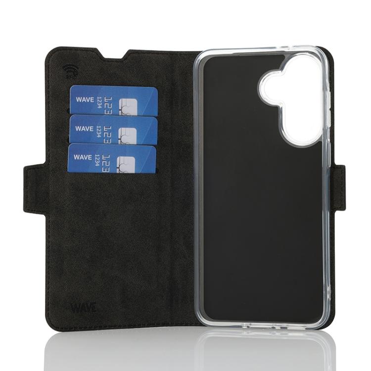 Wave Book Case musta suojakotelo Samsung Galaxy A37 5G puhelimelle. Magneettisulkuinen kansi, korttipaikat RFID suojauksella ja läpinäkyvä muovikelkka (TPU). Pintamateriaali laadukasta nahkaa, jossa antimikrobipinnoite.