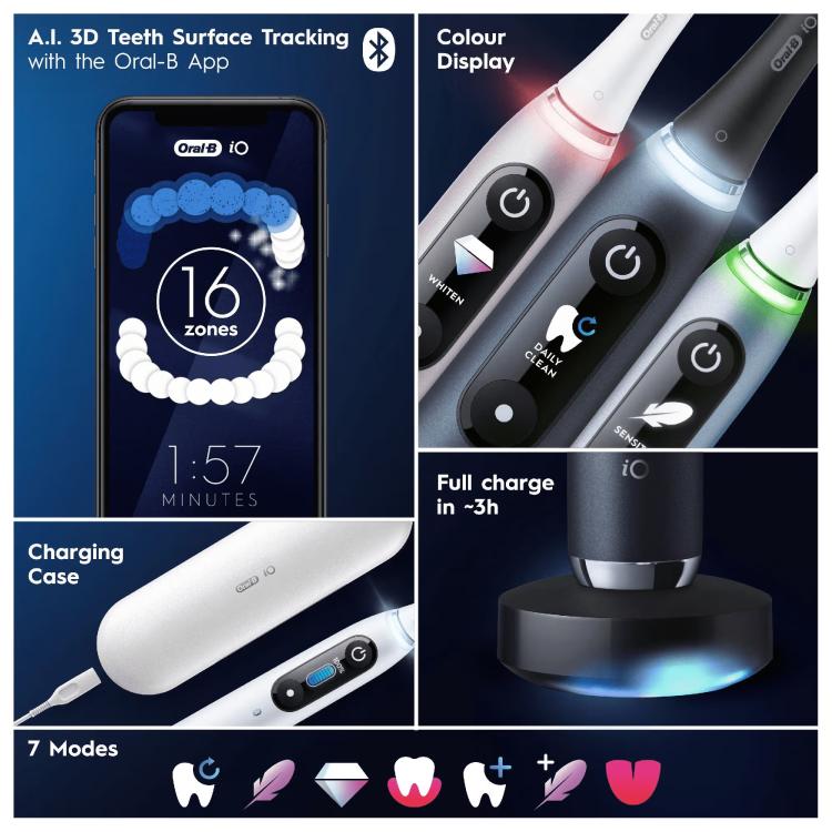 Oral-B:n edistyksellisin iO puhdistusteknologia tarjoaa tehokkaan puhdistuksen. iO-teknologian, 3D-seurannan, tekoälyn ja älykkäiden paineantureiden avulla voit nyt puhdistaa hampaasi entistä paremmin kotona.