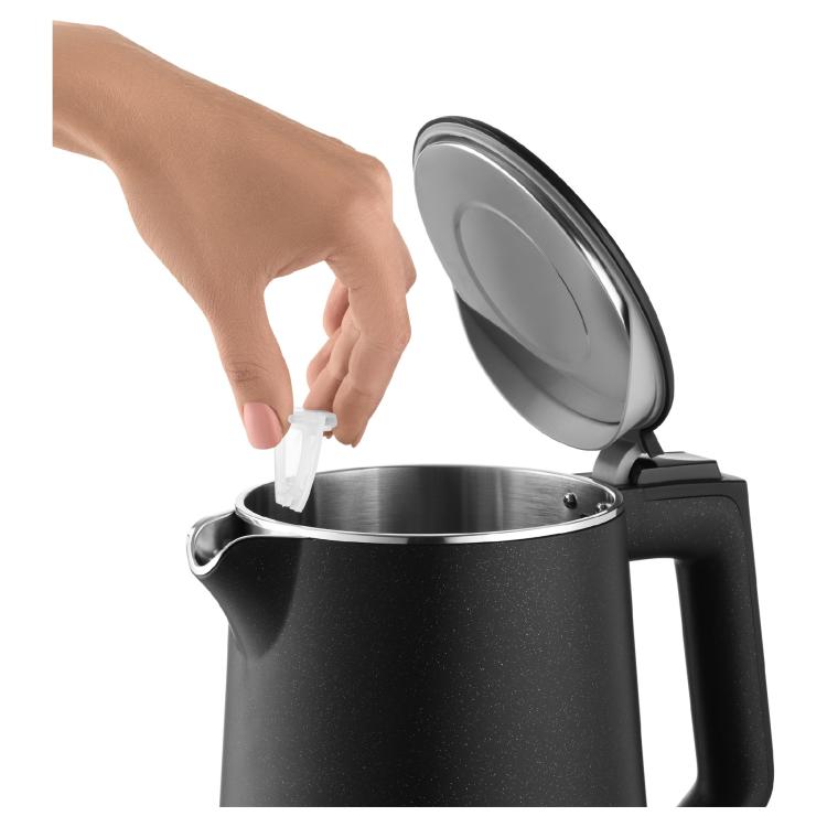 Vedenkeittimessä on automaattisesti avautuva kansi, joka helpottaa täyttämistä, sekä irrotettava ja pestävä kalkkisuodatin, joka pitää veden puhtaana ja raikkaana. Peitetty ruostumattomasta teräksestä valmistettu lämpövastus takaa tehokkaan kuumennuksen. Turvallisuudesta huolehtivat kuivakeittosuoja ja ylikuumenemissuoja, sekä automaattinen virrankatkaisu.