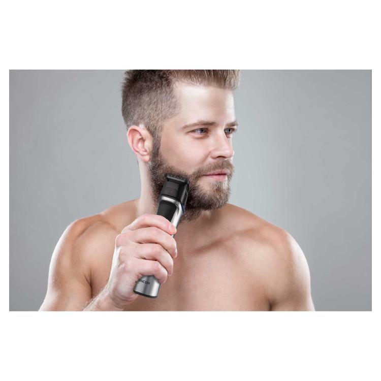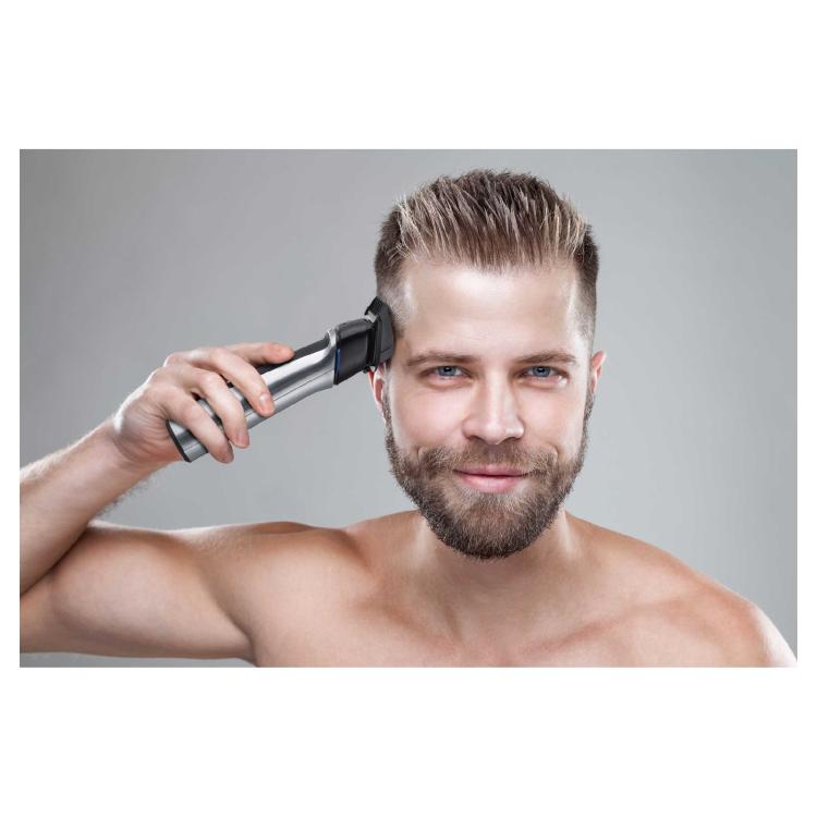 . 14 vaihdettavaa lisävarustetta - Partatrimmeri, Vartalotrimmeri, Nenätrimmeri, Mikroparranajokone, Ohjauskammat, Viistot ohjauskammat korvien alueelle