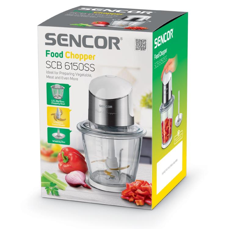 SENCOR SCB6150SS MINISILPPURI. Tehokas 500 W minisilppuri arjen nopeaan pilkkomiseen. 4 titaaniterää, iso 1,5 l lasikulho ja helppo käyttö yhdellä painalluksella. Soveltuu myös soseille ja vauvanruoalle. Turvallinen ja kompakti.