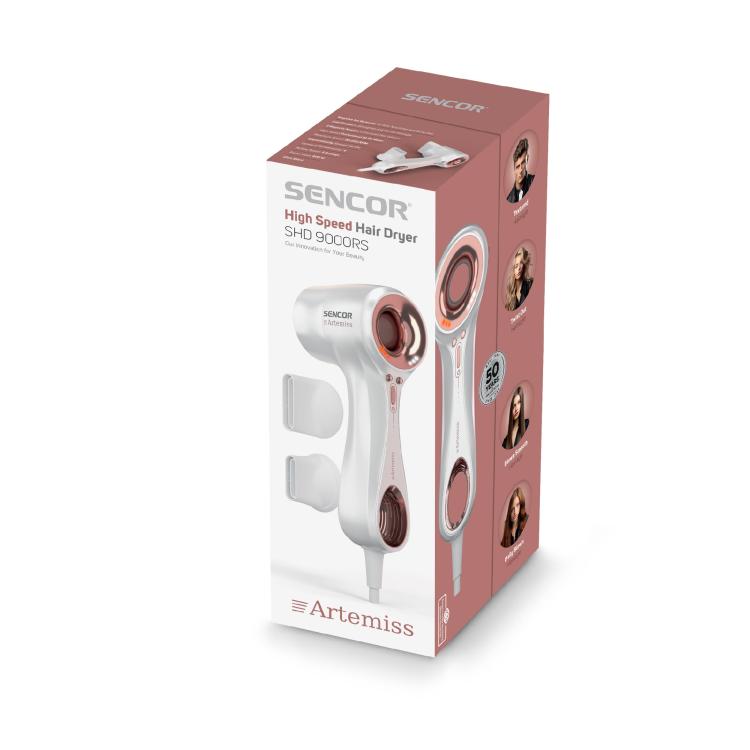 SENCOR SHD9000RS ARTEMISS HIUSTENKUIVAIN. Hiustenkuivain tarjoaa tehokkaan BLDC-moottorin ja jopa 75 km/h ilmavirran nopeaan kuivaamiseen. Ionisaatio, 3 nopeutta ja 4 lämpötilaa takaavat sileän, kiiltävän ja kestävän lopputuloksen.